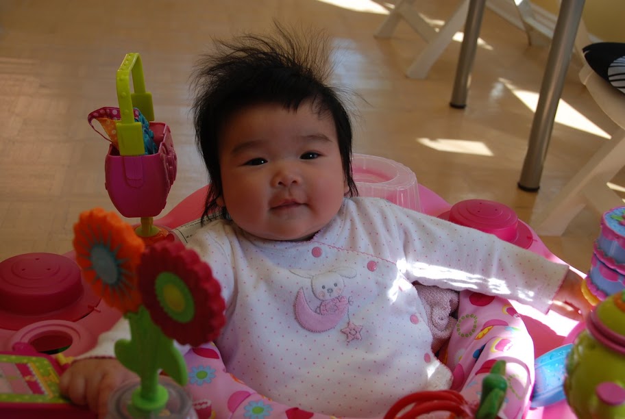 进屋一看,已经一屋子的人了,从1个月到10个月的女孩就有5个,而且,除了那一个月的,剩下的甭管大小,人人头上顶着一个发卡!多悬啊,险些我们小壁虎就落后了。还好妈妈补救及时。