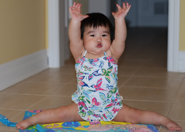 今天Gap打折,憋了几天没给孩子买衣服的妈妈终于又可以过瘾了。第一时间冲到店里,直奔打折商品区,凡是2岁的孩子衣服统统淘出来。战利品包括长裤3条,短裤2条,袜子3双。排队的人可真多啊,足足等的半个小时还没排到。无聊之余跟旁边的妈妈聊天。突然看到妈妈手里一件漂亮的游泳衣。赶紧问在那里拿的。这位妈妈热情的告诉我地方,还答应帮我站着队。火速冲过去,拿了这件泳衣。来不及等到夏天去沙滩了,先来个泳装真人秀吧。