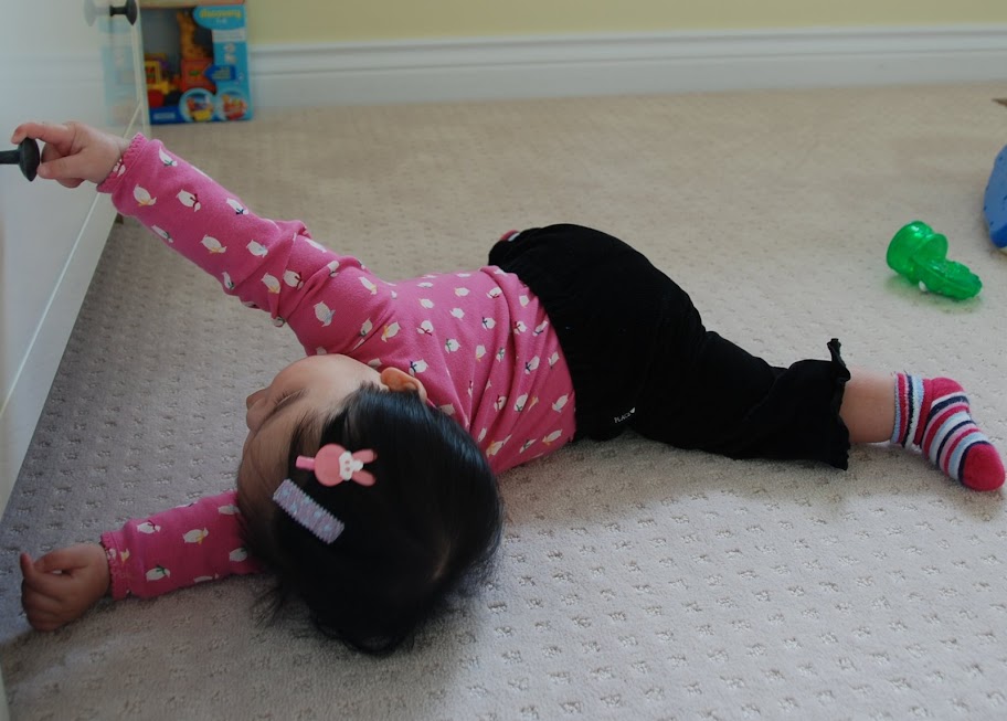 小壁虎最近还学会了爬,哪里危险有电线就往哪里爬,哪里有爷爷奶奶的拖鞋也往哪里爬。 开始动作不太协调,左腿弓着,右腿伸直,从身后画弧到前面,再重复。前天,突然开窍了,手脚也协调了,开始像小青蛙那样爬了。 她还是个大力水手,从椅子,茶几,装满衣服的袋子到吃饭的椅子,全部都能拉动。爷爷奶奶把太阳房进行了大清理,花盆都撤了,插头都堵上了,地板天天擦。但是魔高一尺,道高一丈,小壁虎开始转战厨房,琢磨着开抽屉了。