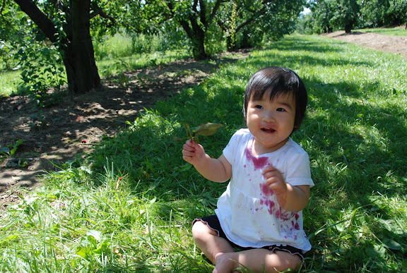 每次小壁虎辛苦揪下来的果实都被妈妈抢过来,把有核的一半咬下来,剩下的给小壁虎吃。吃了十几个后小壁虎就不吃,开始玩了。这时妈妈看见爷爷弯着腰实在难受,就让爷爷看孩子,自己摘,不一会就摘了大半筐。又看见爸爸进展缓慢,于是干脆让爸爸抱着孩子四处转悠,我们继续劳动。