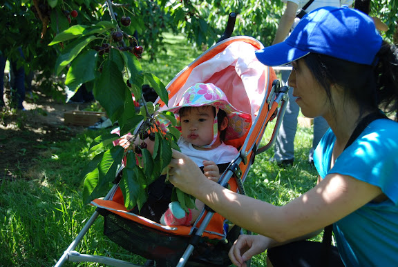 根据壁虎妈妈多年的经验,摘樱桃的着装只能是两种,要不就穿白的,染了可以漂白,要不就穿黑的,染了看不出来。翻箱倒柜的结果是小壁虎穿了小白褂和小黑裤。大大小小连东西带人装了满满一车,壁虎一家就出发了。路上开了一个多小时到了农场。小壁虎很配合,在车上美美睡到了目的地。农场那叫一个热闹,人山人海,估计全多伦多的华人去了九成。