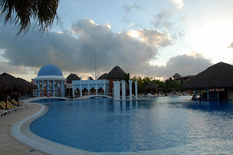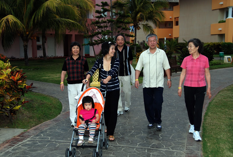 从多伦多起飞的时间是下午 6点。壁虎一家 3点多就到了机场。和上次去欧洲拉练是一个候机厅。小壁虎很快就找到了上次的滑梯,疯玩儿了一起。从多伦多到Varadero 只要3个多小时的航程。小壁虎先是象猴子一样在妈身上跳了一个多小时,看了会儿巧虎,又闹了一会儿睡了。每次带她出门壁虎妈就紧张,表现就是跟壁虎爸说话抬高八度。没办法,这孩子一出门就只认妈了。飞机降落时小壁虎还在睡觉,海关很人性化的让抱孩子的妈走了另外的通道,没排队就入关了。机场有旅行社的人负责接待,指引到去度假村的大巴。小壁虎在古巴夜晚的微风里睡了一会,在上车前醒了。还好路上没闹。到了度假村已经快到午夜。这个Iberostar 度假村修的很漂亮,三个室外游泳池,孩子的游乐场。庭院式的设计,十几个3层小楼。房间宽敞明亮,每个房间都带个阳台。最大的惊喜是有3台中央台的节目!这下老同志们有看的了。这里要提一下,由于美国对古巴的经济封锁,所以从入关后看到好多中国产的东西,负责运送游客的大巴都是中国产的宇通牌。等一切就绪到房间休息已经凌晨,壁虎一家赶紧洗洗睡了。