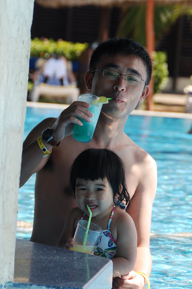 小壁虎在沙滩挖了一会儿沙子就不干了,又让爸爸抱着入海玩儿了一会就转战游泳池了。这个度假村有给孩子玩的小小游泳池,还有玩具滑梯之类的东西。大的游泳池一边也是浅浅的水,很适合小孩子玩。游泳池的另一边还有一个吧台,可以坐在水里的凳子上点饮料喝。古巴游是吃喝全包,无论是在海滩上游泳还是在游泳池玩,都有服务生送饮料,花园的园丁还给游客砍椰子喝,高兴了就给一两快的小费。
