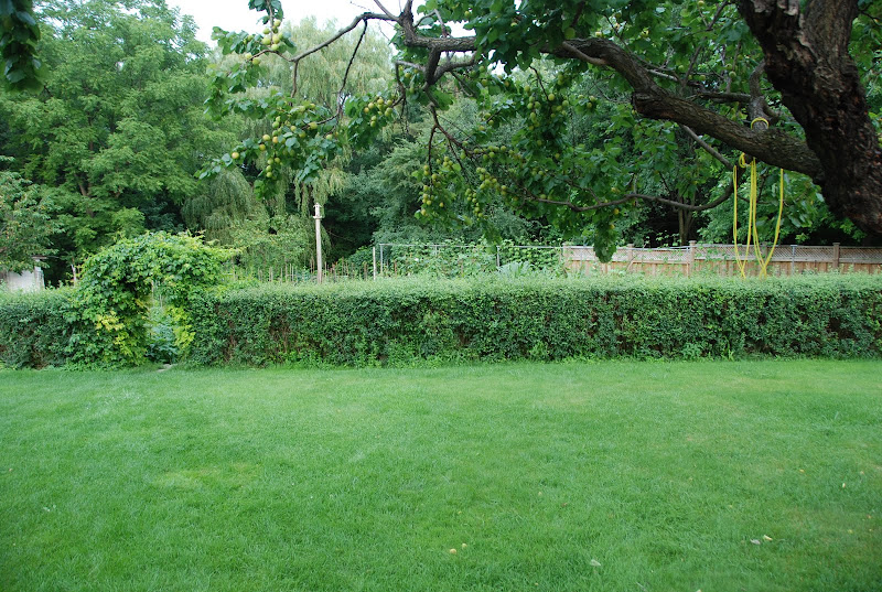 壁虎妈看着小松鼠跳到树上糟蹋胜利果实简直心疼不已,逼着壁虎爸买了能找到的最高的梯子,可是也只能把小树上的果实摘了,大树有两层楼那么高,无论如何也够不着。七月份的第二个周末,大家都来聚会,姥爷围着大树绕了好几圈,琢磨这怎么才能把大树上的杏弄下来。壁虎妈饭后跑了趟商店,回来一看一大家子人都在院子里呢,原来爷爷拿一个旧的窗帘杆,头上绑了个勾子,就可以够着最上面的杏了,这边壁虎姨夫站在梯子上,壁虎爸在下面扶着梯子,爷爷奶奶姥爷和Andy 在下面拿毯子接着,姥姥领着Lucas 弟弟和小壁虎在旁边看,壁虎姨跑前跑后忙着录像。这上面打杏的人也没准,四处乱飞,一小半都掉到了地上,于是就听姥姥在这边喊,Lucas, 不能跑,砸着头,KK,过来过来,别踩了地上的杏,那边壁虎爸一手扶着梯子,一手忙着往嘴里塞杏,还有壁虎妈和壁虎姨指挥抓毯子的人如何才能最大面积的接到掉下来的杏。