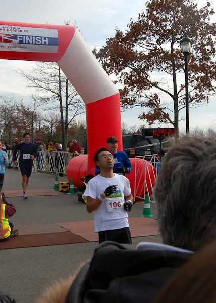 仰头冲刺过线,“run through the finish line,not to the finish line”, 是我教练对我们的教导。等狂奔过线后才慢下来,按stop键都按了两次才按停,一看时间,holy!1:29:28!