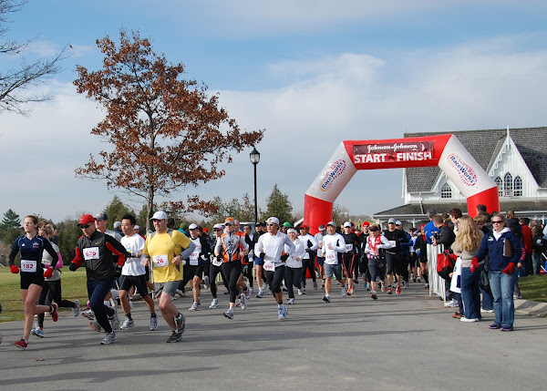 Golf Club的前门封了路,大家都走后门,窜过一大片荒地,才开到了高尔夫球场后面的一空地临时停车场。停好车看时间只有半小时了,就把胖妞丢给了她妈,我自己先狂奔去了。穿过高尔夫球场和一条小溪,爬上一小坡,就到了club house。进去领上timing chip,戴上,然后上厕所又放了点儿水。