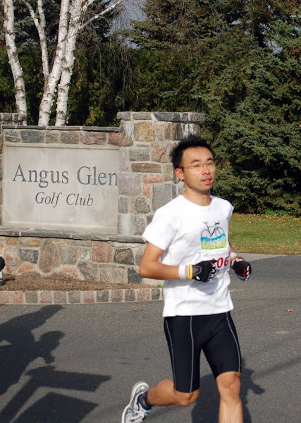 今天正好夏令时改时间,早上多睡了一个小时,休息得特好。吃个全麦Bagel夹花生酱,喝了杯牛奶,还吃了个胖妞他爷爷烙的饼。去Angus Glen Golf Course的路上还吃了半块PowerBar,剩下的半块赛前15分钟热身时吃了。(本想带Gel的,结果昨晚找了N个supermarket都没找到。)