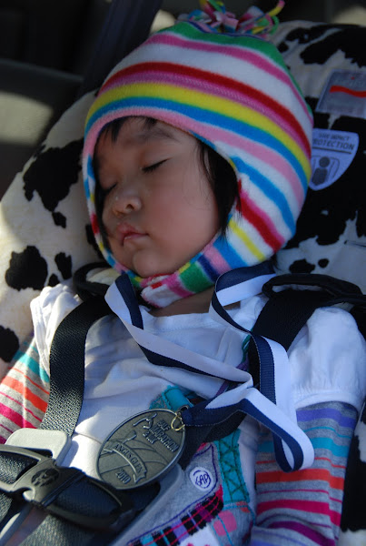 这后面,就看见远远的卷毛妈带着小卷毛跑过了,才3岁的孩子,虽然已经很累了,还很努力的自己跑,坚持到了终点,估计是年龄最小的选手了吧。(比起来,小壁虎最爱说的话就是“妈妈抱!”)。