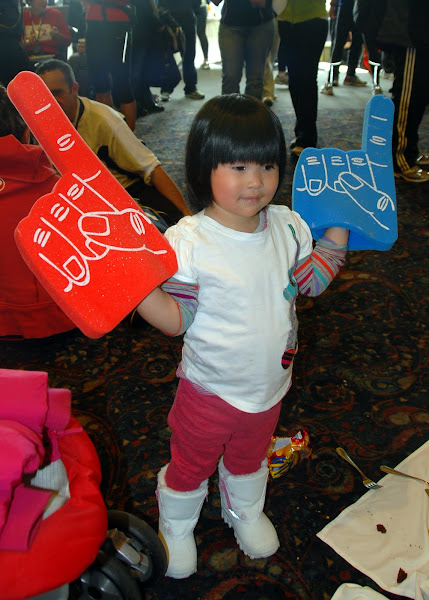 这里要说一下,所有答应来助威的亲友团统统低估了停车的拥挤程度和走到起点的距离,纷纷迟到,不但错过了壁虎爸出发,等赶到大门口又错过了南下小区里绕了一圈又绕回来观战的机会。看来只有等壁虎爸冲刺了。拖大带小,大队人马赶紧赶回比赛地点给1公里少儿比赛的孩子们加油,壁虎妈认识的孩子就有4名,小表哥Andy,佩佩姐姐,桐桐姐姐和刚满3岁的小卷毛哥哥。小壁虎认真的举着牌子给哥哥加油,冻的一把鼻涕一把泪,小手冰冷,但拒绝戴手套。(注意,姥姥的牌子举倒了)。